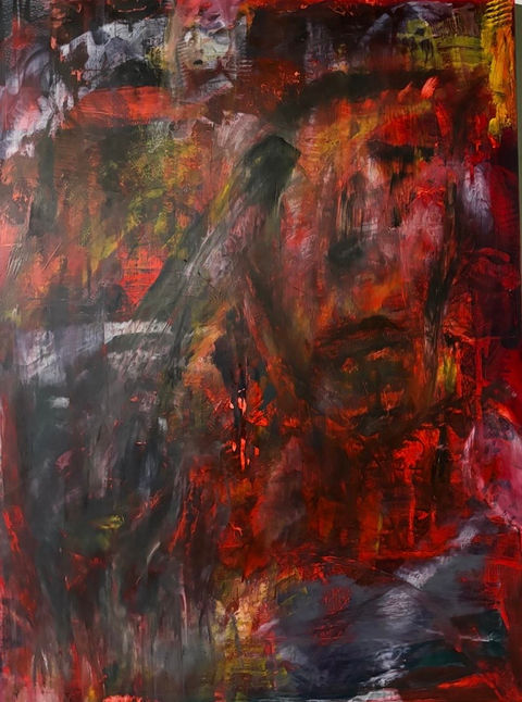 The thoughts that race in our heads. The more time is spent looking at this piece, the more faces can be found. Sometimes its hard to turn off the noise. Santiago's first oil and cold wax abstract painting really stands out.