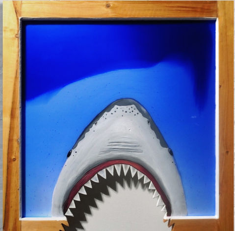 Sharks are normally scary and are portrayed in that manner. Here the artists chose to take a different route; it is fun, lively and beautiful to look at.